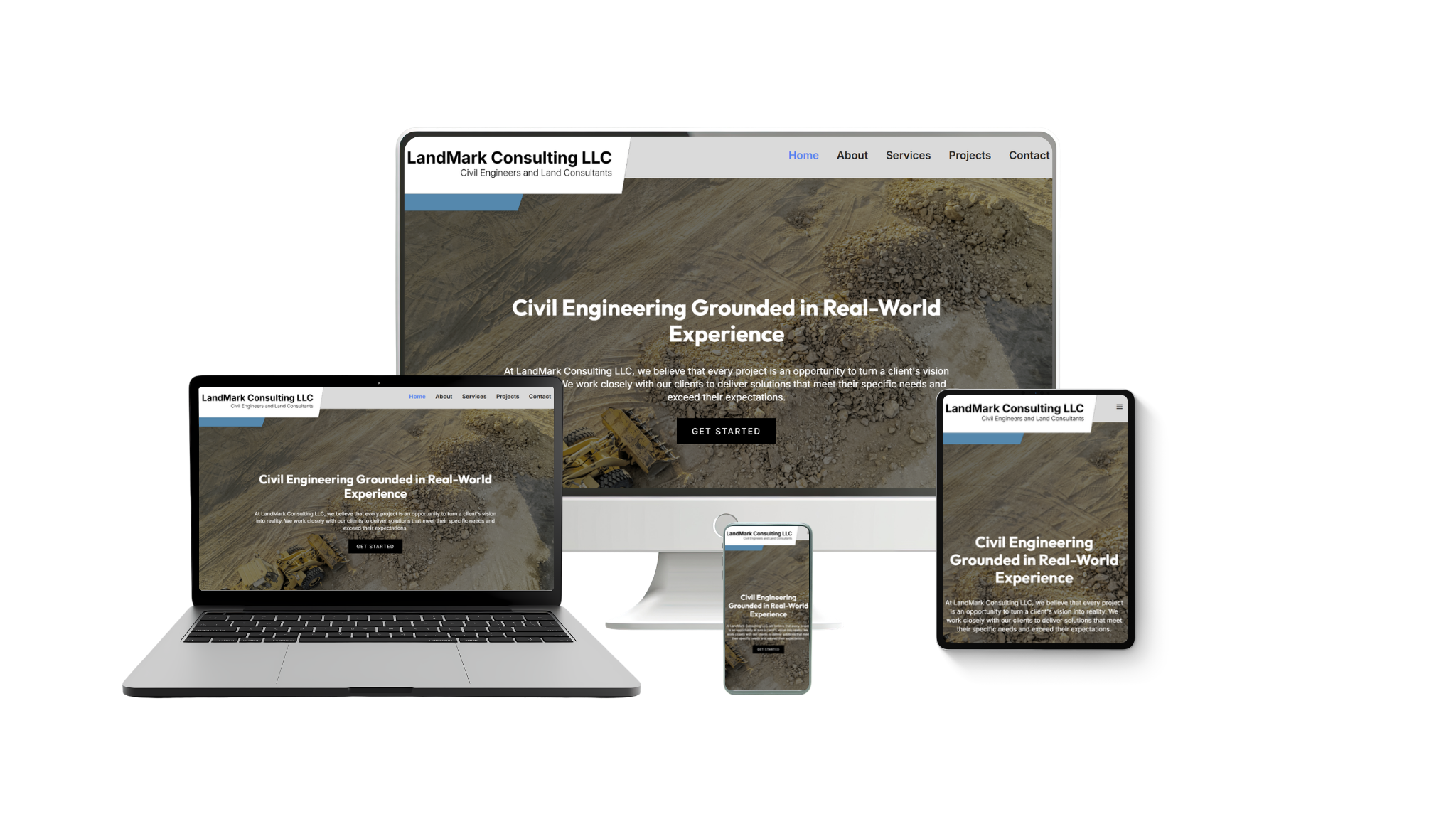 We delivered an 11-page website redesign that elevated LandMark Consulting's brand and online presence to match the quality of their engineering work. The clean design uses three base colors and strategic visual transitions between sections to create visual interest while maintaining professionalism. The expanded services page provides deeper descriptions of their four core offerings—civil engineering design, utility design, project management, and construction observation—each presented with imagery, title, and detailed description. A Projects portfolio built in Webflow's CMS allows the team to easily add new work as it completes, essential for a firm in growth mode. Individual team member profiles on the About page emphasize the real-world field experience that differentiates LandMark from traditional engineering firms. The result is a professional resource they can confidently share with partners and prospects—transforming what was costing them business into an asset that reinforces their credibility and reflects the practical, hands-on approach they bring to every project.